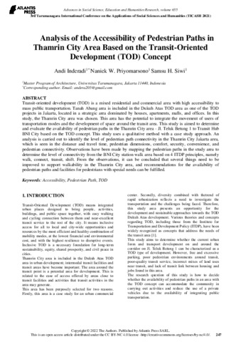 Analysis of the Accessibility of Pedestrian Paths in Thamrin City Area Based on the Transit-Oriented Development (TOD) Concept fix.pdf Download (893kB) | Preview |