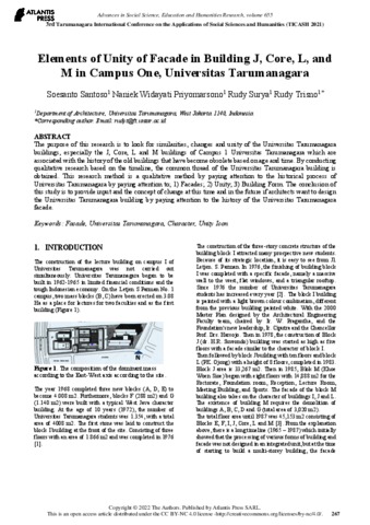 Soesanto Santoso, Penulis Pertama and Naniek Widayati Priyomarsono, Penulis Kedua and Rudy Surya, Penulis Ketiga and Rudy Trisno, Penulis Keempat Elements of Unity of Facade in Building J, Core, L, and M in Campus One, Universitas Tarumanagara. Elements of Unity of Facade in Building J, Core, L, and M in Campus One, Universitas Tarumanagara.