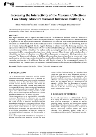 Brian Wibisono, Penulis Pertama and Samsu Hendra Siwi, Penulis Kedua and Naniek Widayati Priyomarsono, Penulis Ketiga Increasing the Interactivity of the Museum Collections Case Study: Museum Nasional Indonesia Building A. Increasing the Interactivity of the Museum Collections Case Study: Museum Nasional Indonesia Building A.