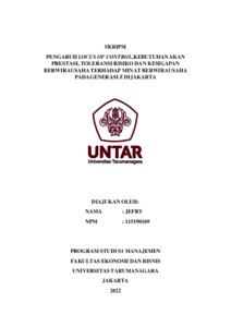 Jefry, Jefry (2022) PENGARUH LOCUS OF CONTROL,KEBUTUHAN AKAN PRESTASI, TOLERANSI RISIKO DAN KESIGAPAN BERWIRAUSAHA TERHADAP MINAT BERWIRAUSAHA PADAGENERASI Z DIJAKARTA. Skripsi thesis, Universitas Tarumanagara.