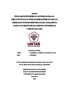 Aurellia, Karenina (2023) PENGARUH PENDIDIKAN KEWIRAUSAHAAN, KREATIVITAS DAN EFIKASI DIRI KEWIRAUSAHAAN TERHADAP INTENSI BERWIRAUSAHA MAHASISWA FAKULTAS EKONOMI DAN BISNIS UNIVERSITAS TARUMANAGARA. Skripsi thesis, Universitas Tarumanagara.