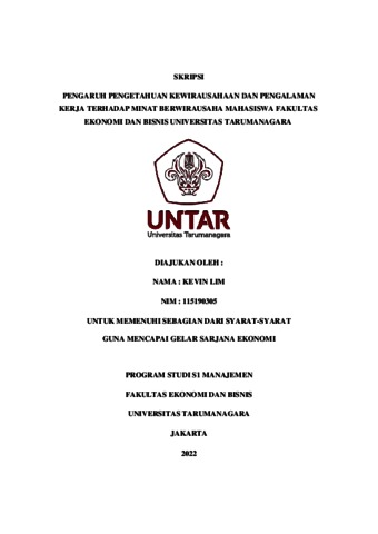 Lim, Kevin (2022) PENGARUH PENGETAHUAN KEWIRAUSAHAAN DAN PENGALAMAN KERJA TERHADAP MINAT BERWIRAUSAHA MAHASISWA FAKULTAS EKONOMI DAN BISNIS UNIVERSITAS TARUMANAGARA. Skripsi thesis, Universitas Tarumanagara.