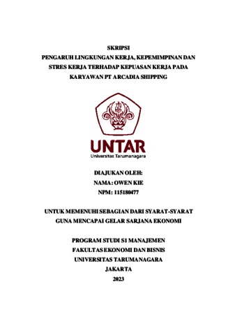 Kie, Owen (2023) PENGARUH LINGKUNGAN KERJA, KEPEMIMPINAN DAN STRES KERJA TERHADAP KEPUASAN KERJA PADA KARYAWAN PT ARCADIA SHIPPING. Skripsi thesis, Universitas Tarumanagara.