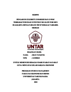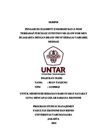 Tanjung, Rian (2022) PENGARUH CELEBRITY ENDORSER DAN E-WOM TERHADAP PURCHASE INTENTION MS GLOW FOR MEN DI JAKARTA DENGAN BRAND TRUST SEBAGAI VARIABEL MEDIASI. Skripsi thesis, Universitas Tarumanagara.
