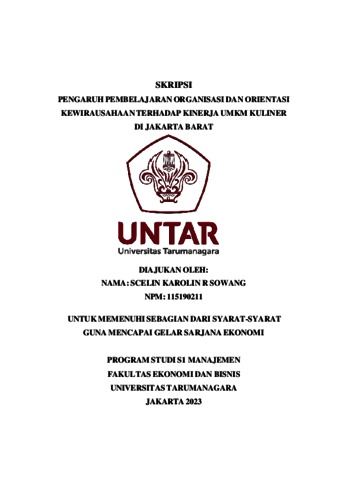 Karolin, Scelin (2023) PENGARUH PEMBELAJARAN ORGANISASI DAN ORIENTASI KEWIRAUSAHAAN TERHADAP KINERJA UMKM KULINER DI JAKARTA BARAT. Skripsi thesis, Universitas Tarumanagara.