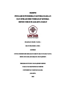 Fransisca, Selvi (2022) PENGARUH PENDIDIKAN KEWIRAUSAHAAN DAN EFIKASI DIRI TERHADAP KINERJA BISNIS UMKM DI JAKARTA BARAT. Skripsi thesis, Universitas Tarumanagara.
