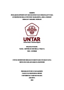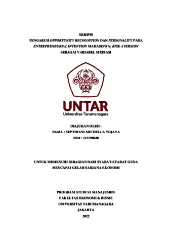 Michella, Septihani (2022) PENGARUH OPPORTUNITY RECOGNITION DAN PERSONALITY PADA ENTREPRENEURIAL INTENTION MAHASISWA: RISK AVERSION SEBAGAI VARIABEL MEDIASI. Skripsi thesis, Universitas Tarumanagara.