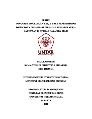 Christofle, Vivaldi (2022) PENGARUH LINGKUNGAN KERJA, GAYA KEPEMIMPINAN DAN BUDAYA ORGANISASI TERHADAP KEPUASAN KERJA KARYAWAN DI PT PIJAR NAYANIKA BELIA. Skripsi thesis, Universitas Tarumanagara.