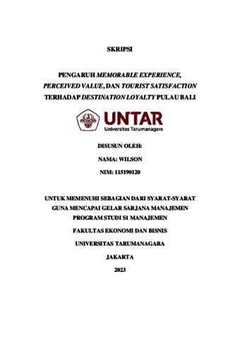 Wilson, Wilson (2023) PENGARUH MEMORABLE EXPERIENCE, PERCEIVED VALUE, DAN TOURIST SATISFACTION TERHADAP DESTINATION LOYALTY PULAU BALI. Skripsi thesis, Universitas Tarumanagara.