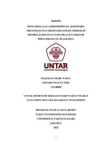 Mawan, Yonard (2023) PENGARUH GAYA KEPEMIMPINAN, KOMITMEN ORGANISASI DAN IKLIM ORGANISASI TERHADAP KINERJA KARYAWAN PADA PEGAWAI SEKTOR PERTAMBANGAN DI JAKARTA. Skripsi thesis, Universitas Tarumanagara.