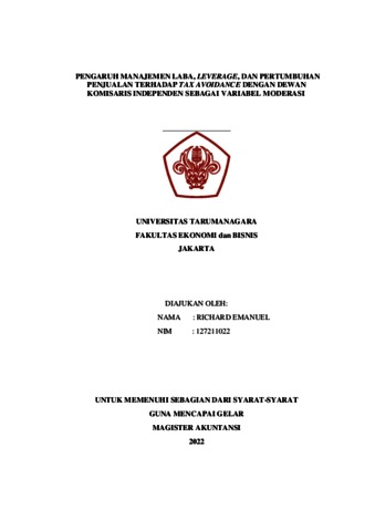 Emanuel, Richard (2022) PENGARUH MANAJEMEN LABA, LEVERAGE, DAN PERTUMBUHAN PENJUALAN TERHADAP TAX AVOIDANCE DENGAN DEWAN KOMISARIS INDEPENDEN SEBAGAI VARIABEL MODERASI. Masters thesis, Universitas Tarumanagara.