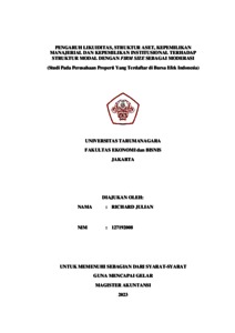 Julian, Richard (2022) PENGARUH LIKUIDITAS, STRUKTUR ASET, KEPEMILIKAN MANAJERIAL DAN KEPEMILIKAN INSTITUSIONAL TERHADAP STRUKTUR MODAL DENGAN FIRM SIZE SEBAGAI MODERASI (Studi Pada Perusahaan Properti Yang Terdaftar di Bursa Efek Indonesia). Masters thesis, Universitas Tarumanagara.