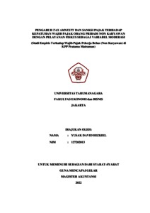 David, Yusak (2022) PENGARUH TAX AMNESTY DAN SANKSI PAJAK TERHADAP KEPATUHAN WAJIB PAJAK ORANG PRIBADI NON KARYAWAN DENGAN PELAYANAN FISKUS SEBAGAI VARIABEL MODERASI (Studi Empiris Terhadap Wajib Pajak Pekerja Bebas (Non Karyawan) di KPP Pratama Matraman). Masters thesis, Universitas Tarumanagara.