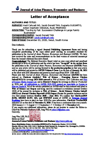 hadi cahyadi, Korespondensi (2021) Korespondensi Too Big to Fail: Succession Challenge in Large Family Businesses. Too Big to Fail: Succession Challenge in Large Family Businesses, 8 (1). ISSN pISSN 2288-4637 / eISSN 2288-4645