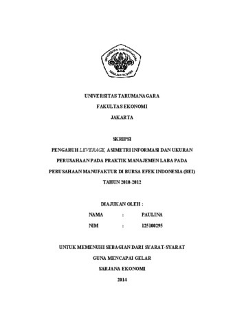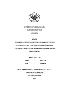 Paulina, Paulina (2014) PENGARUH LEVERAGE, ASIMETRI INFORMASI DAN UKURAN PERUSAHAAN PADA PRAKTIK MANAJEMEN LABA PADA PERUSAHAAN MANUFAKTUR DI BURSA EFEK INDONESIA (BEI) TAHUN 2010-2012. Skripsi thesis, Universitas Tarumanagara.