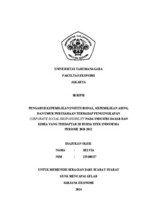 Selvia, Selvia (2014) PENGARUH KEPEMILIKAN INSTITUSIONAL, KEPEMILIKAN ASING, DAN UMUR PERUSAHAAN TERHADAP PENGUNGKAPAN CORPORATE SOCIAL RESPONSIBILITY PADA INDUSTRI DASAR DAN KIMIA YANG TERDAFTAR DI BURSA EFEK INDONESIA PERIODE 2010-2012. Skripsi thesis, Universitas Tarumanagara.