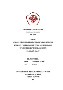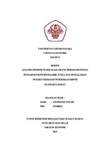 Untari, Stephanie (2014) ANALISIS PERSEPSI WAJIB PAJAK ORANG PRIBADI MENGENAI PENGARUH PROFESIONALISME, ETIKA, DAN PENGALAMAN NOTARIS TERHADAP PENERIMAAN BHPTB DI JAKARTA BARAT. Skripsi thesis, Universitas Tarumanagara.