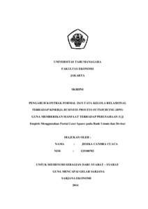 Cuaca, Jesika Candra (2014) PENGARUH KONTRAK FORMAL DAN TATA KELOLA RELASIONAL TERHADAP KINERJA BUSINESS PROCESS OUTSOURCING (BPO ) GUNA MEMBERIKAN MANFAAT TERHADAP PERUSAHAAN (Uji Empiris Menggunakan Partial Least Square pada Bank Umum dan Devisa). Skripsi thesis, Universitas Tarumanagara.