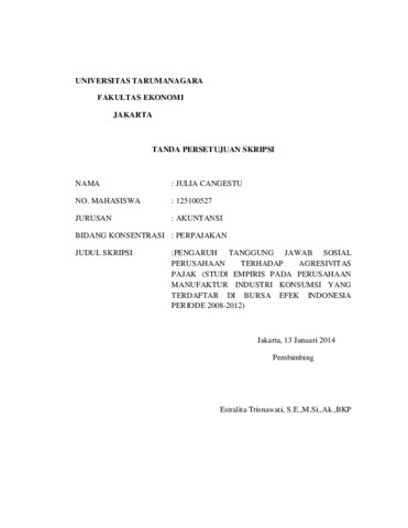Cangestu, Julia (2014) PENGARUH TANGGUNG JAWAB SOSIAL PERUSAHAAN TERHADAP AGRESIVITAS PAJAK (STUDI EMPIRIS PADA PERUSAHAAN MANUFAKTUR INDUSTRI KONSUMSI YANG TERDAFTAR DI BURSA EFEK INDONESIA PERIODE 2008-2012). Skripsi thesis, Universitas Tarumanagara.