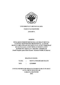 Halim, Metta Indahsari (2014) PENGARUH INDEPENDENSI DALAM SIKAP MENTAL AUDITOR, SKEPTISISME PROFESIONAL AUDITOR, BUDAYA ORGANISASI, DAN RED FLAG AUDIT TERHADAP KUALITAS JASA AUDIT DENGAN BUKTI AUDIT KOMPETEN SEBAGAI VARIABEL MODERASI (Studi Empirik pada Klien Kantor Akuntan Publik di Jakarta ). Skripsi thesis, Universitas Tarumanagara.