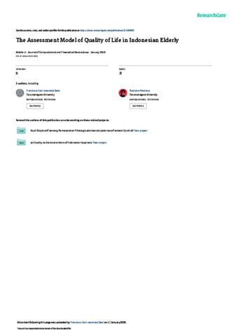 Dewi, Fransisca Iriani Roesmala and Rostiana, Rostiana and Rumawas, Marcella E. (2018) The Assesment Model of Quality of Life in Indonesian Elderly. In the forthcoming years, Indonesia will reach a demographic bonus through the continuing rapid growth of the aging population. Older individuals have to encounter physical, psychological, social and financial problems, which ultimately may burden the soc, 24 (1). pp. 417-419. ISSN 1936-6612