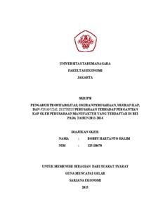 Halim, Bobby Hartanto (2015) PENGARUH PROFITABILITAS, UKURA N PERUSAHAAN, UKURA N KA P, DAN FINANCIAL DISTRESS PERUSAHAAN TERHADAP PERGANTIAN KAP OLEH PERUSAHAAN MANUFAKTUR YANG TERDAFTAR DI BEi PADA TAHUN 2011-2014. Skripsi thesis, Universitas Tarumanagara.