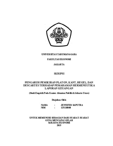 Saputra, Jennifer (2015) PENGARUH PEMIKIRAN PLATON, KANT, HEGEL, DAN DESCARTES TERHADAP PEMAHAMAN HERMENEUTIKA LAPORAN KEUANGAN (Studi Empirik Pada Kantor Akuntan Publik di Jakarta Utara). Skripsi thesis, Universitas Tarumanagara.