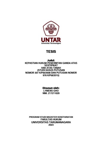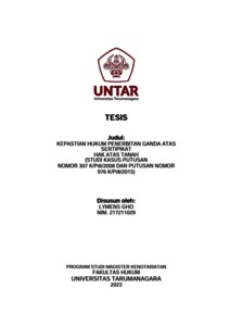 Gho, Lymens (2023) Kepastian Hukum Penerbitan Ganda Atas Sertipikat Hak Atas Tanah (Studi Kasus Putusan Nomor 307 K/Pdt/2008 Dan Putusan Nomor 976 K/Pdt/2015). Masters thesis, Universitas Tarumanagara.