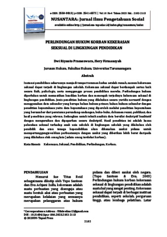 Prameswara, Dwi Riyanto and Firmansyah, Hery (2023) Perlindungan Hukum Korban Kekerasan Seksual Di Lingkungan Pendidikan. NUSANTARA : Jurnal Ilmu Pengetahuan Sosial, 10 (4).