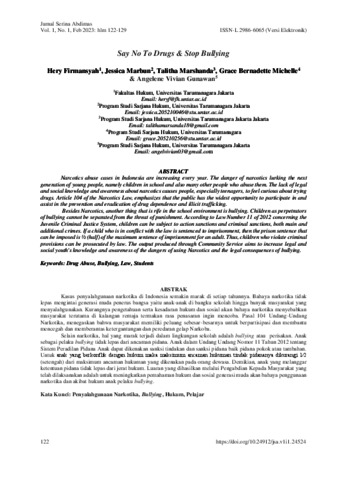 Firmansyah, Hery and Marbun, Jessica and Marshanda, Talitha and Michelle4, Grace Bernadette and Gunawan, Angelene Vivian (2023) Say No To Drugs & Stop Bullying. Jurnal Serina Abdimas, 1 (1). ISSN 2986-6065