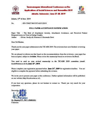 Elvina Jesslyn, Penulis Pertama and Fransisca Iriani Roesmala Dewi, Penulis Kedua (2019) Bukti Korespondensi Trust in Dating Couples: Attachment Anxiety, Attachment Avoidance, and Perceived Partner Responsiveness. TICASH 2019. (Unpublished)
