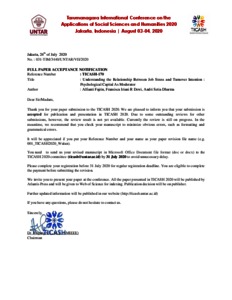 Alfianti Fajrin, Penulis Pertama and Fransisca Iriani Roesmala Dewi, Penulis Kedua and Andri Setia Dharma, Penulis Ketiga (2020) Bukti Korespondensi Understanding the Relationship Between Job Stress and Turnover Intention: Psychological Capital As Moderator. TICASH 2020. (Unpublished)