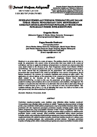 Martin, Gregorius and Hutabarat, Rugun Romaida (2022) Penerapan Pembelaan Terpaksa Terhadap Pelaku Dalam Tindak Pidana Penganiayaan Yang Menyebabkan Kematian (Studi Kasus Putusan Pengadilan Negeri Pasir Pangaraian Nomor 39/PID.B/2019/PN.PRP). Jurnal Hukum Adigama, 5 (1).