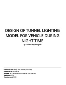 Pragantha, Jeanny and Setyaningsih, Endah (2018) DESIGN OF TUNNEL LIGHTING MODEL FOR VEHICLE DURING NIGHT TIME. In: The 3rd International Conference on Engineering of Tarumanagara (ICET) 2017.