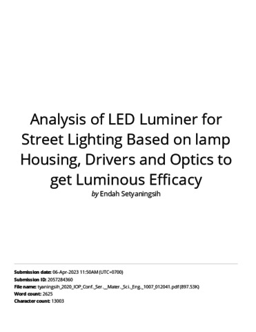 Setyaningsih, Endah and Calvinus, Yohanes and Sabtalistia, Yunita A. (2020) Analysis of LED Luminer for Street Lighting Based on lamp Housing, Drivers and Optics to get Luminous Efficacy. In: IOP Conference Series: Materials Science and Engineering.