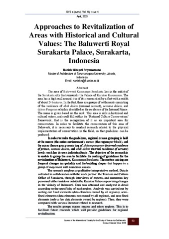 TURNITIN Approaches to Revitalization of Areas with Historical and Cultural Values_ The Baluwerti Royal Surakarta Palace, Surakarta, Indonesia.pdf Download (2MB) | Preview |