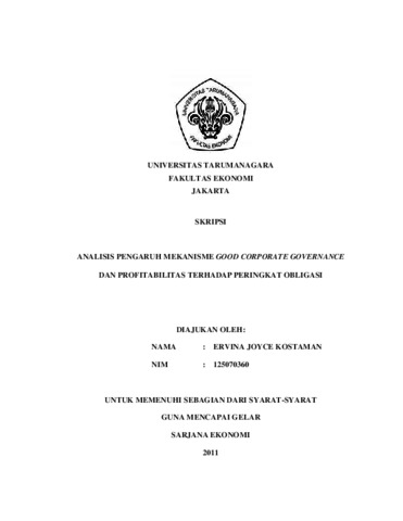 Kostaman, Ervina Joyce (2011) ANALISIS PENGARUH MEKANISME GOOD CORPORATE GOVERNANCE DAN PROFITABILITAS TERHADAP PERINGKAT OBLIGASI. Skripsi thesis, Universitas Tarumanagara.