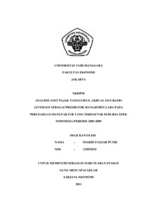 Putri, Ingrid Fadjar (2011) ANALISIS ASET PAJAK TANGGUHAN, AKRUAL DAN RASIO LEVERAGE SEBAGAI PREDIKTOR MANAJEMEN LABA PADA PERUSAHAAN MANUFAKTUR YANG TERDAFTAR DI BURSA EFEK INDONESIA PERIODE 2005-2009. Skripsi thesis, Universitas Tarumanagara.