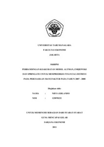 Erlando, Nisya (2011) PERBANDINGAN KEAKURATAN MODEL ALTMAN, ZMIJEWSKI DAN SPRINGATE UNTUK MEMPREDIKSI FINANCIAL DISTRESS PADA PERUSAHAAN MANUFAKTUR PADA TAHUN 2007 - 2008. Skripsi thesis, Universitas Tarumanagara.