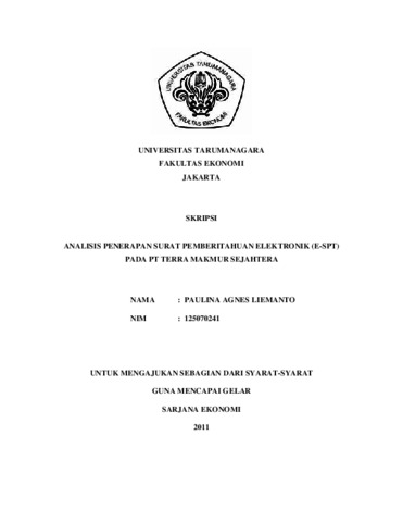 Liemanto, Paulina Agnes (2011) ANALISIS PENERAPAN SURAT PEMBERITAHUAN ELEKTRONIK (E-SPT) PADA PT TERRA MAKMUR SEJAHTERA. Skripsi thesis, Universitas Tarumanagara.
