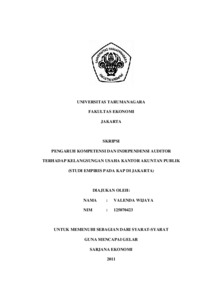 Wijaya, Valenda (2011) PENGARUH KOMPETENSI DAN INDEPENDENSI AUDITOR TERHADAP KELANGSUNGAN USAHA KANTOR AKUNTAN PUBLIK (STUDI EMPIRIS PADA KAP DI JAKARTA). Skripsi thesis, Universitas Tarumanagara.