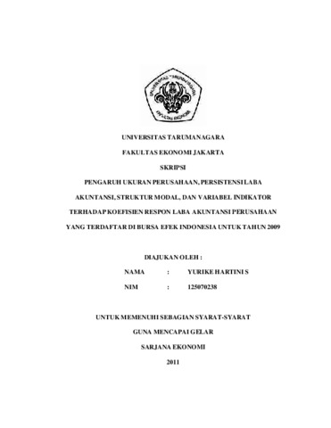 Tujuan diadakannya penelitian ini adalah untuk meneliti pengaruh ukuran perusahaan, persistensi laba akuntansi, struktur modal, serta variabel indikator dengan koefisien respon laba akuntansi. Data yang digunakan adalah 80 perusahaan yang ada di Bursa Efek Indonesia (BEI) serta harga saham pada periode pengamatan pada tahun 2009. Metode penelitian yang digunakan adalah penelitian kepustakaan yang kemudian diolah menggunakan program komputer dengan membuat hipotesis H1-H5. Berdasarkan penelitian yang dilakukan secara bersama-sama, ditemukan pengaruh ukuran perusahaan, persistensi laba akuntansi, struktur modal, serta variabel indikator dengan koefisien respon laba akuntansi. Berdasarkan hasil penelitian, secara terpisah hanya persistensi laba akuntansi yang memiliki pengaruh terhadap koefisien respon laba akuntansi, sedangkan untuk ukuran perusahaan, struktur modal, dan variabel indikator secara terpisah tidak memiliki pengaruh terhadap koefisien respon laba akuntansi.