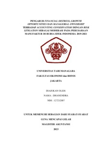 Dhanendra, Dhanendra (2023) PENGARUH FINANCIAL DISTRESS, GROWTH OPPORTUNITIES DAN MANAGERIAL OWNERSHIP TERHADAP ACCOUNTING CONSERVATISM DENGAN RISK LITIGATION SEBAGAI MODERASI PADA PERUSAHAAN MANUFAKTUR DI BURSA EFEK INDONESIA 2019-2021. Skripsi thesis, Universitas Tarumanagara.