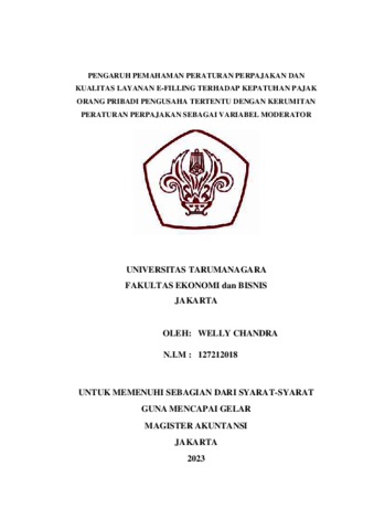 Chandra, Welly (2023) PENGARUH PEMAHAMAN PERATURAN PERPAJAKAN DAN KUALITAS LAYANAN E-FILLING TERHADAP KEPATUHAN PAJAK ORANG PRIBADI PENGUSAHA TERTENTU DENGAN KERUMITAN PERATURAN PERPAJAKAN SEBAGAI VARIABEL MODERATOR. Skripsi thesis, Universitas Tarumanagara.