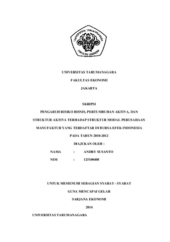 Susanto, Andri (2014) PENGARUH RISIKO BISNIS, PERTUMBUHAN AKTIVA, DAN STRUKTUR AKTIVA TERHADAP STRUKTUR MODAL PERUSAHAAN MANUFAKTUR YANG TERDAFTAR DI BURSA EFEK INDONESIA PADA TAHUN 2010-2012. Skripsi thesis, Universitas Tarumanagara.