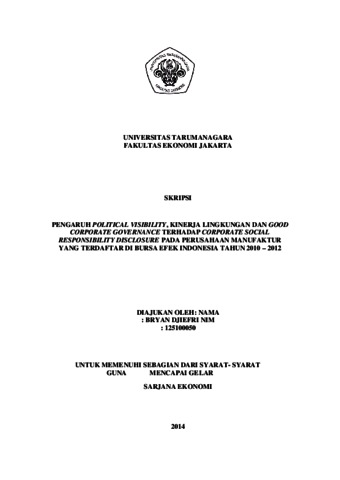 Djiefri, Bryan (2014) PENGARUH POLITICAL VISIBILITY, KINERJA LINGKUNGAN DAN GOOD CORPORATE GOVERNANCE TERHADAP CORPORATE SOCIAL RESPONSIBILITY DISCLOSURE PADA PERUSAHAAN MANUFAKTUR YANG TERDAFTAR DI BURSA EFEK INDONESIA TAHUN 2010 – 2012. Skripsi thesis, Universitas Tarumanagara.