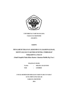 Sugiyono, Melina (2014) PENGARUH TEKANAN, KESEMPATAN, RASIONALISASI, MOTIVASI, DAN FAKTOR GENETIKA TERHADAP TERJADINYA FRAUD (Studi Empirik Pada Klien Kantor Akuntan Publik Big Four). Skripsi thesis, Universitas Tarumanagara.