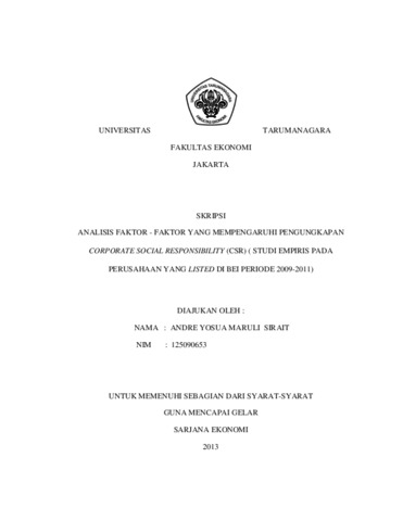 Sirait, Andre Yosua Maruli (2014) ANALISIS FAKTOR - FAKTOR YANG MEMPENGARUHI PENGUNGKAPAN CORPORATE SOCIAL RESPONSIBILITY (CSR) ( STUDI EMPIRIS PADA PERUSAHAAN YANG LISTED DI BEI PERIODE 2009-2011). Skripsi thesis, Universitas Tarumanagara.