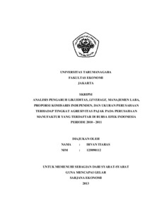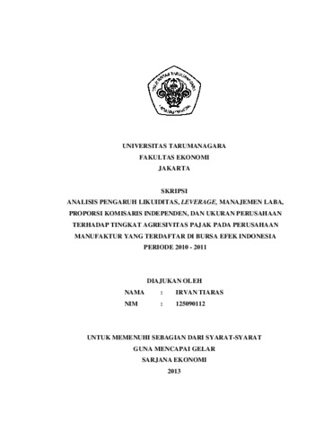 Tiaras, Irvan (2014) ANALISIS PENGARUH LIKUIDITAS, LEVERAGE, MANAJEMEN LABA, PROPORSI KOMISARIS INDEPENDEN, DAN UKURAN PERUSAHAAN TERHADAP TINGKAT AGRESIVITAS PAJAK PADA PERUSAHAAN MANUFAKTUR YANG TERDAFTAR DI BURSA EFEK INDONESIA PERIODE 2010 - 2011. Skripsi thesis, Universitas Tarumanagara.