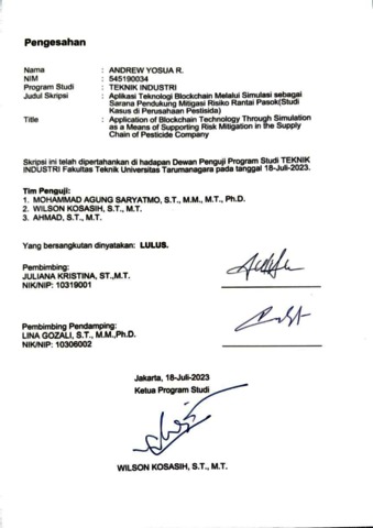 Yosua, Andrew (2023) Aplikasi teknologi blockchain melalui simulasi sebagai sarana pendukung mitigasi risiko rantai pasok(studi kasus di perusahaan pestisida) (T. Ind - 826). Skripsi thesis, Universitas Tarumanagara.